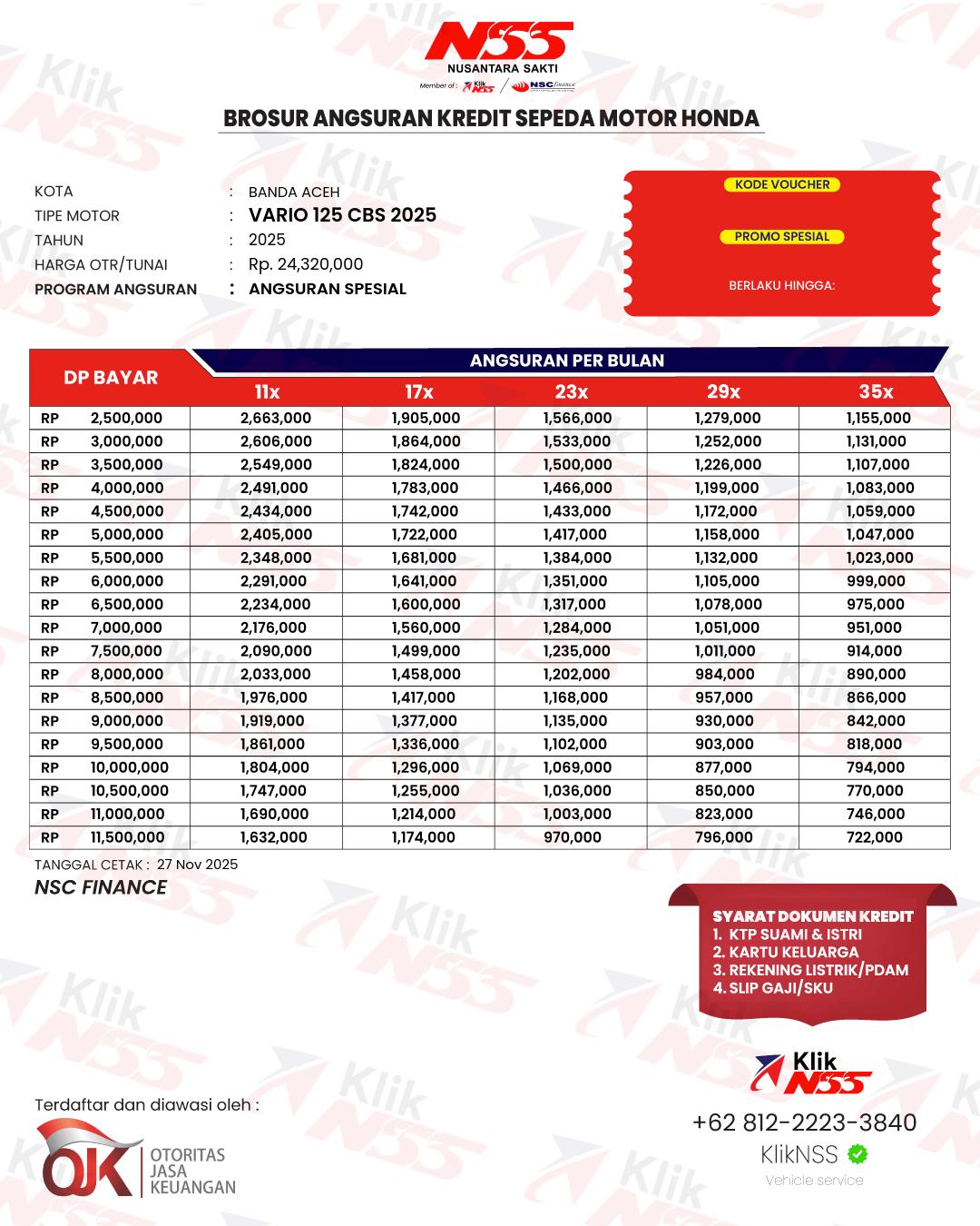 Kini, Anda bisa mendapatkan penawaran spesial untuk kredit Vario 125 DP 5 jt dengan angsuran mulai 900 ribu yang dapat dilakukan melalui Dealer Honda Nusantara Sakti terdekat di area Jakarta dan Tangerang.