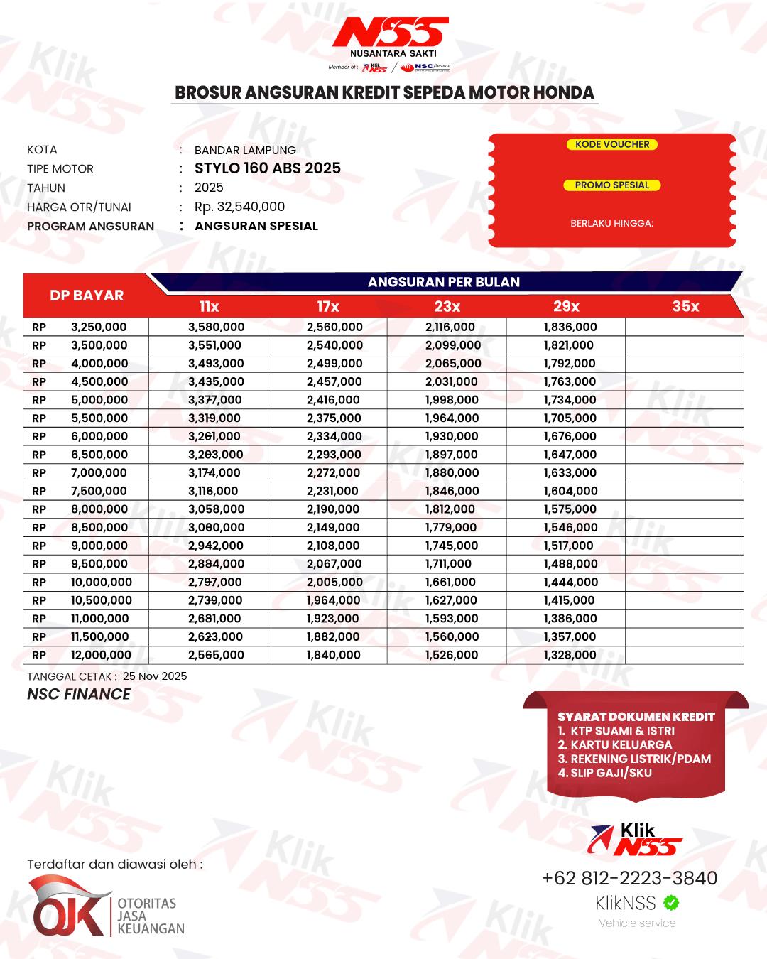 Jika Anda tertarik untuk membelinya, kini terdapat penawaran spesial untuk kredit motor Honda Stylo 160 DP 2 juta dan cicilan mulai 1,3 juta yang dapat dilakukan melalui Dealer Honda Nusantara Sakti terdekat di area Jakarta dan Tangerang.